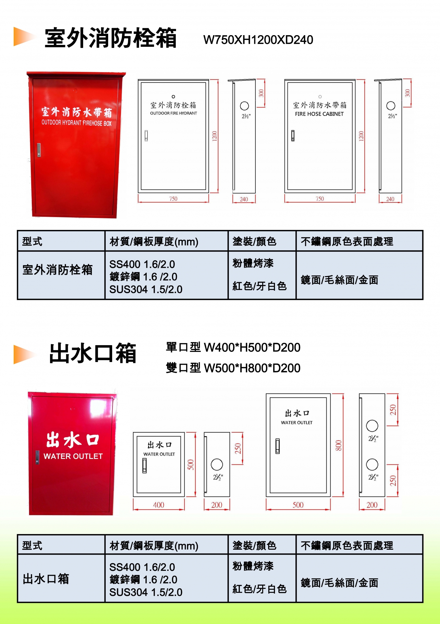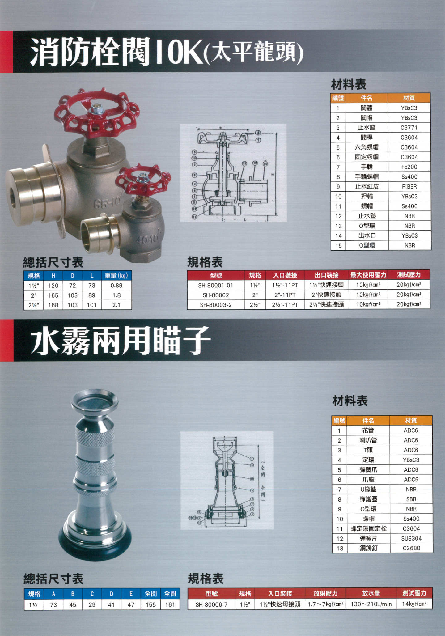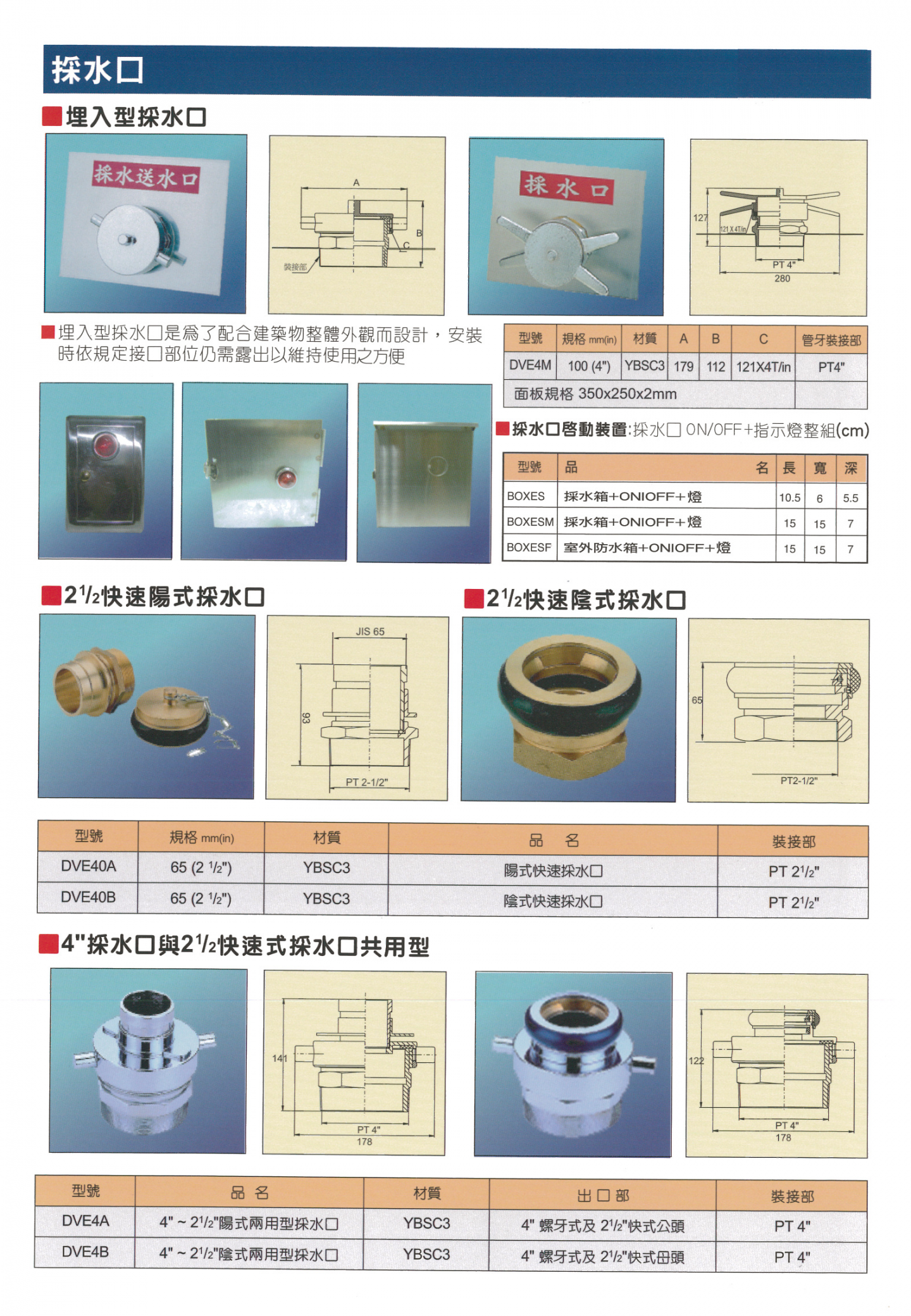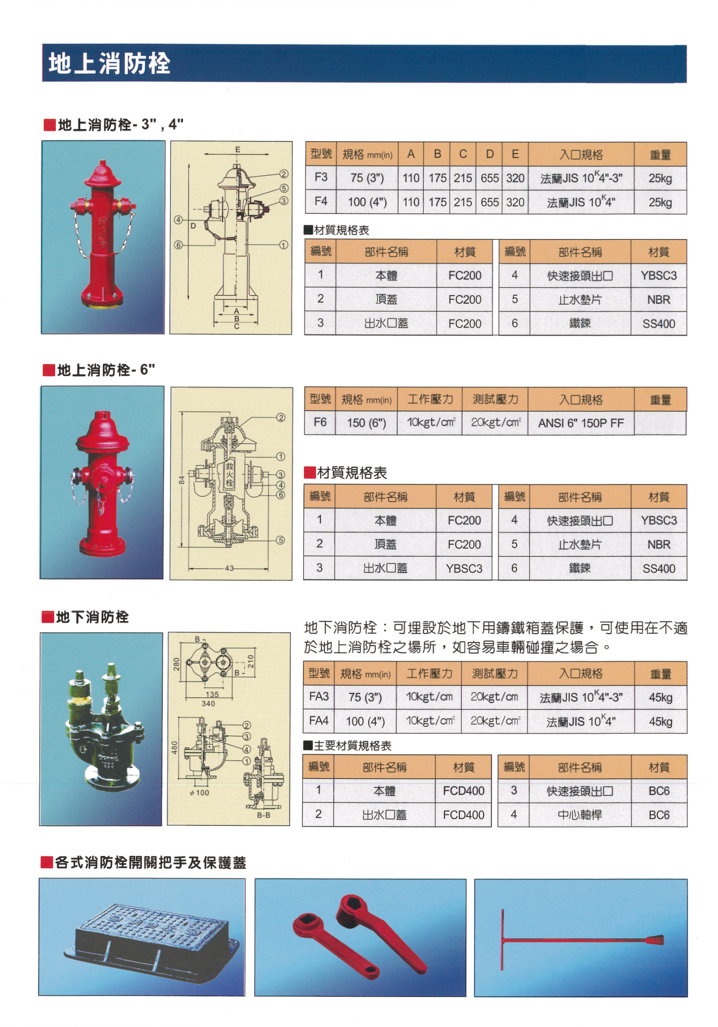 出水口、第二種消防栓箱 地上消防栓 直射水霧兩用瞄子Spray Nozzle 室內、室外消防栓水帶箱 室內消防栓箱 室外消防栓箱、出水口箱 背帶式瞄子(銅)、直射瞄子 消防水帶附快速接頭1 消防水帶附快速接頭2 消防栓閥(太平龍頭)消防用出水瞄子 消防栓閥、水霧兩用瞄子 消防栓閥、減壓型消防栓閥 消防栓閥Hydrant Valve For Fighting Use 消防送水口、採水口 消防送水口 採水口