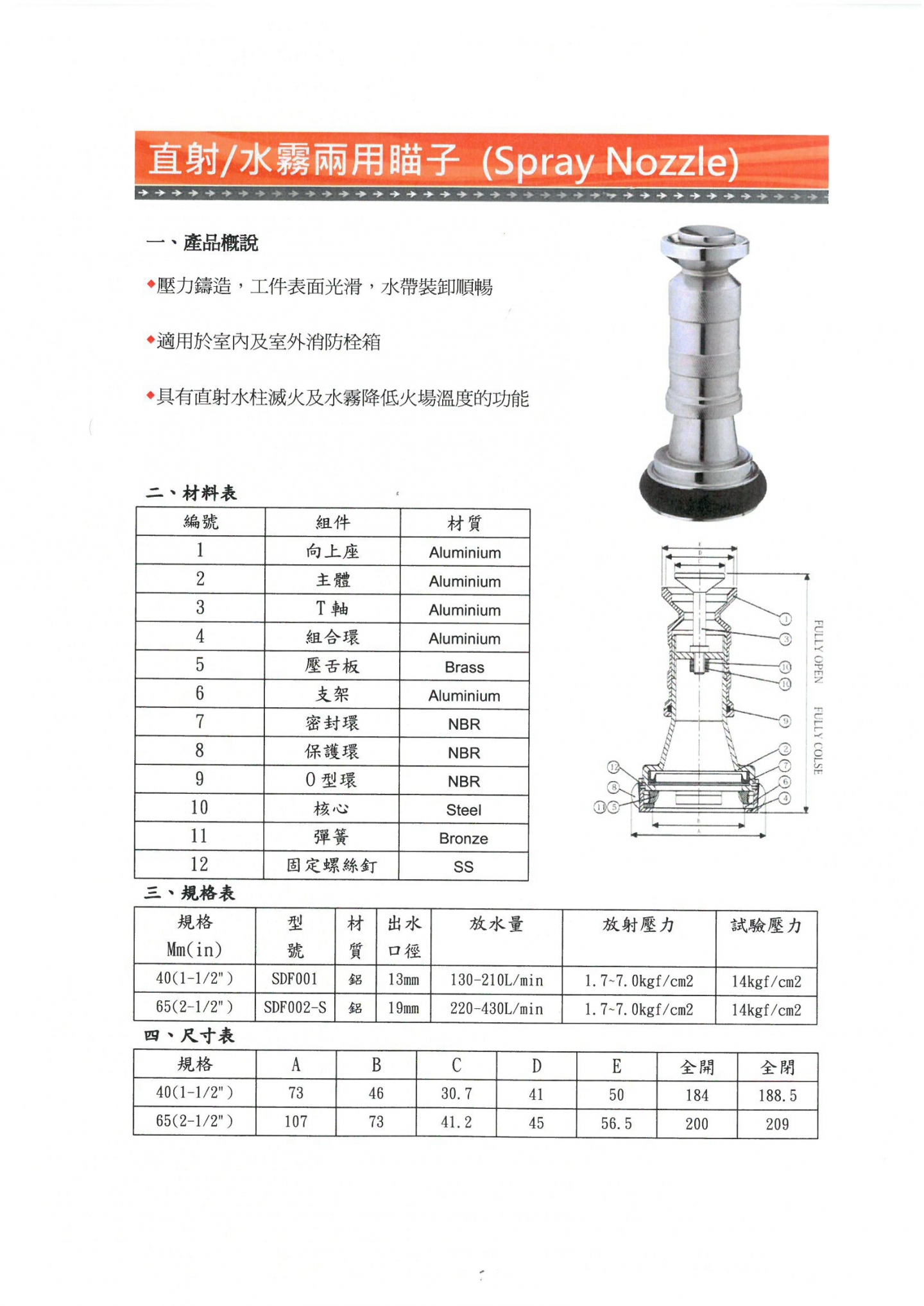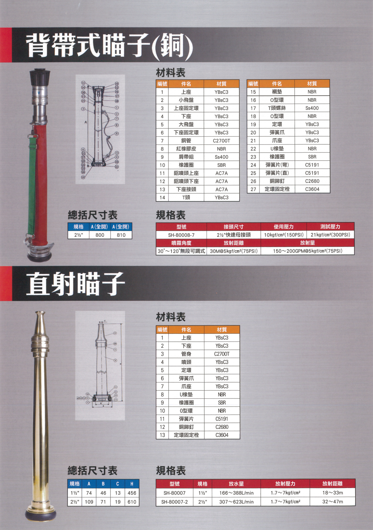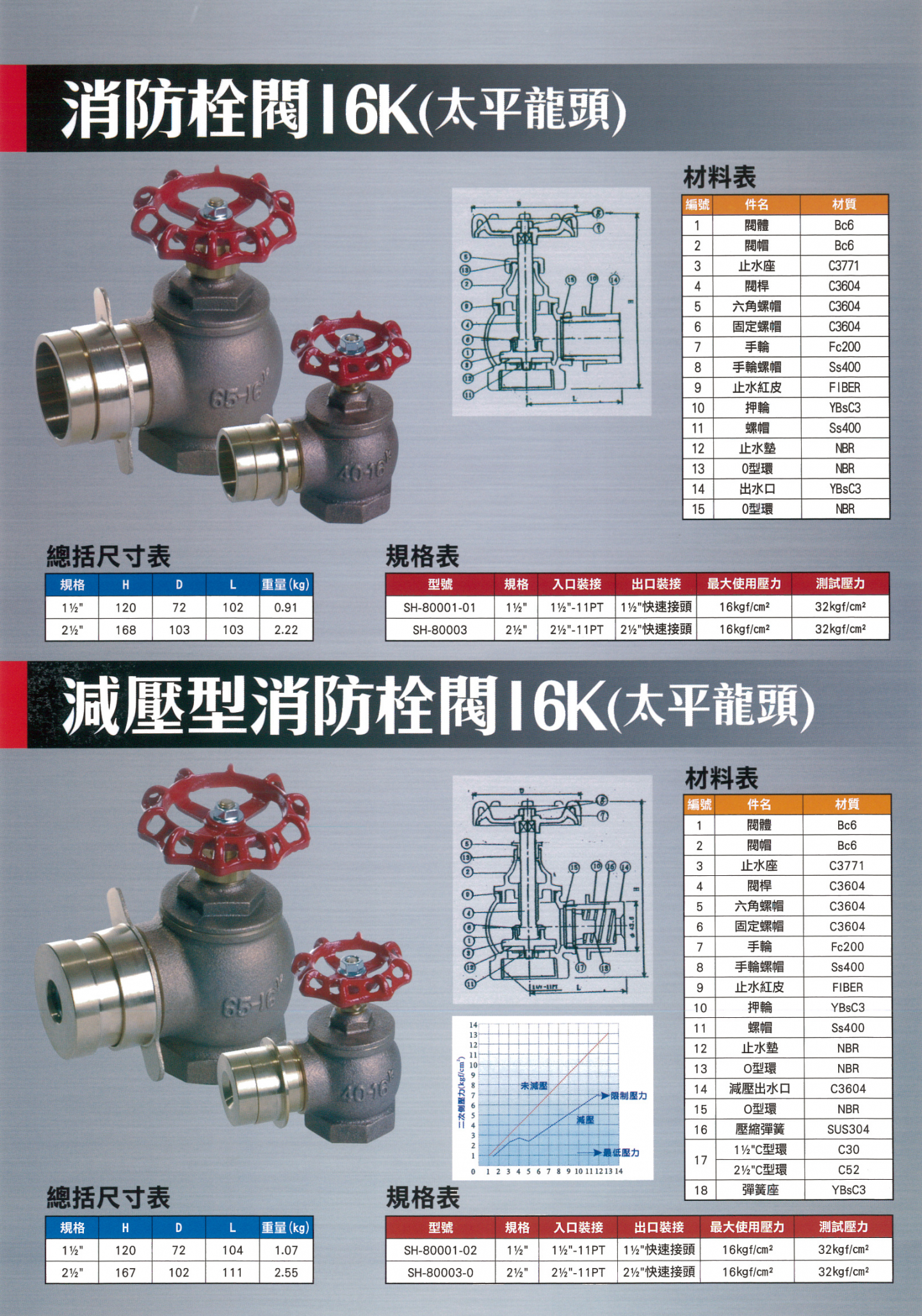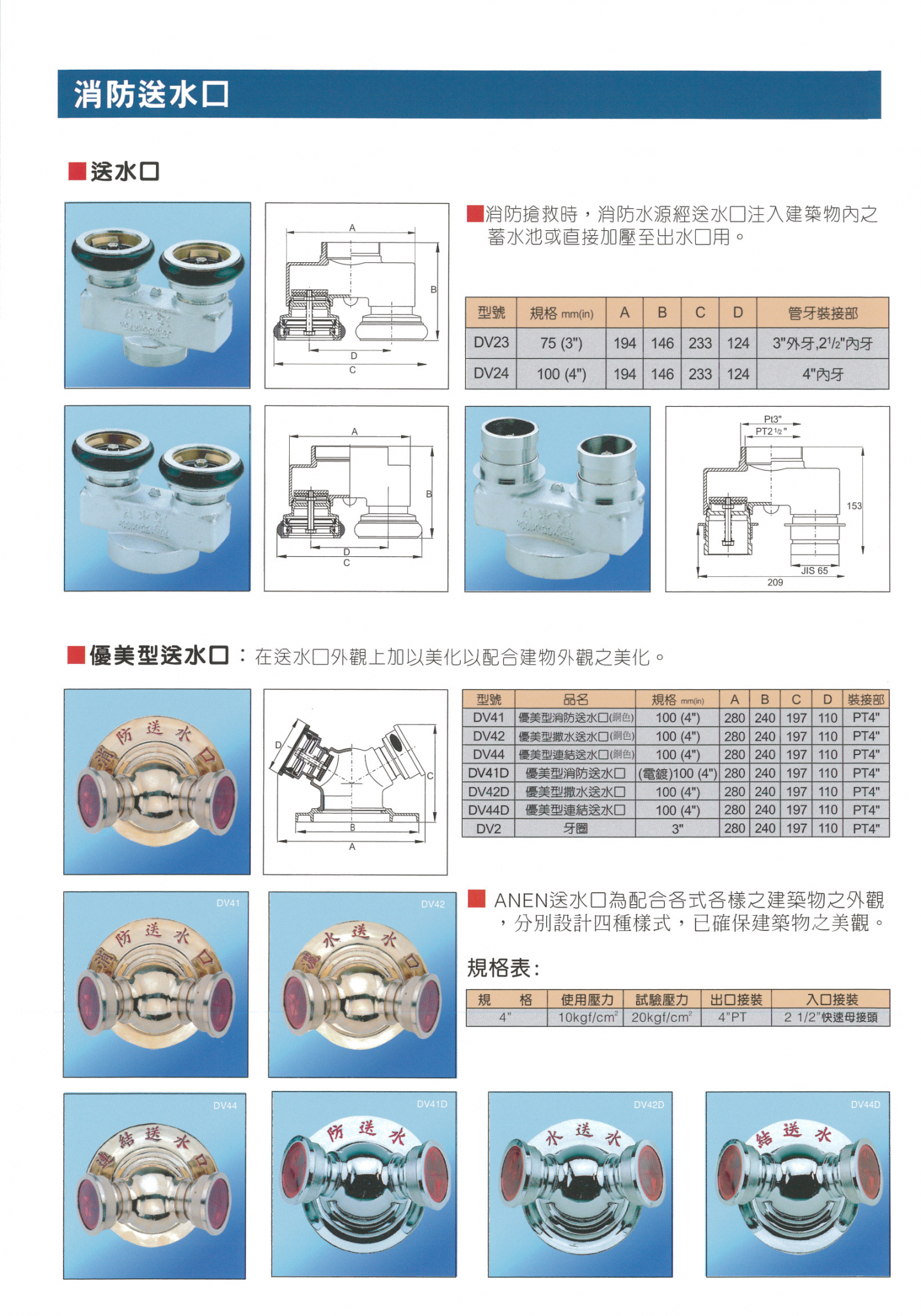 出水口、第二種消防栓箱 地上消防栓 直射水霧兩用瞄子Spray Nozzle 室內、室外消防栓水帶箱 室內消防栓箱 室外消防栓箱、出水口箱 背帶式瞄子(銅)、直射瞄子 消防水帶附快速接頭1 消防水帶附快速接頭2 消防栓閥(太平龍頭)消防用出水瞄子 消防栓閥、水霧兩用瞄子 消防栓閥、減壓型消防栓閥 消防栓閥Hydrant Valve For Fighting Use 消防送水口、採水口 消防送水口 採水口